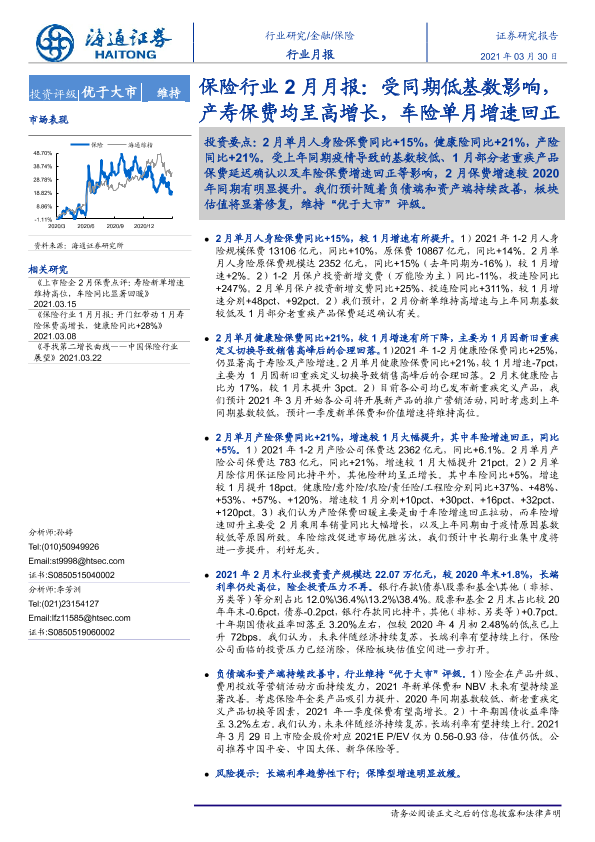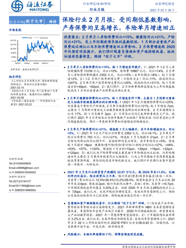 【海通证券】【20210330】保险行业2月月报:受同期低基数影响,产寿保费均呈高增长,车险单月增速回正-5页