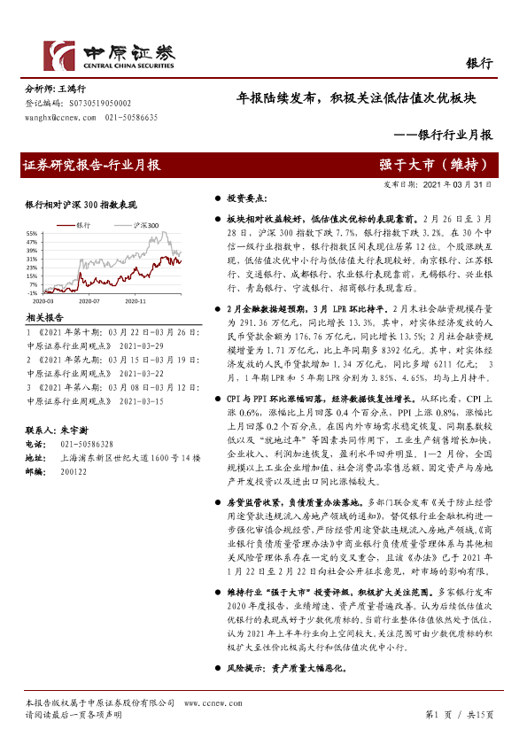 【中原证券】【20210331】银行行业月报:年报陆续发布,积极关注低估值次优板块-15页