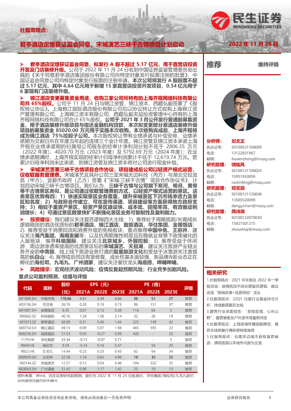 【民生证券】【20221128】社服周观点:君亭酒店定增获证监会同意,宋城演艺三峡千古情项目计划启动-25页