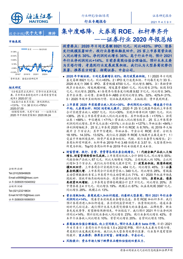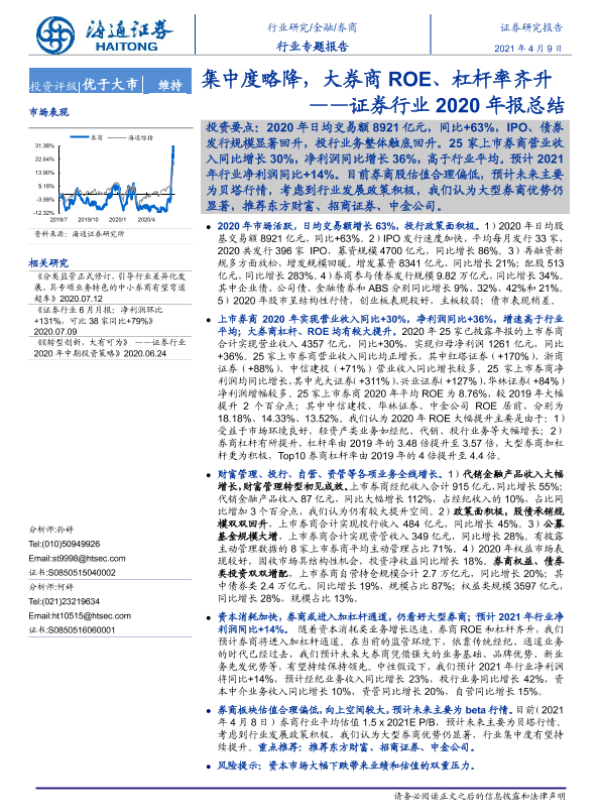【海通证券】【20210409】证券行业2020年报总结:集中度略降,大券商ROE、杠杆率齐升-23页