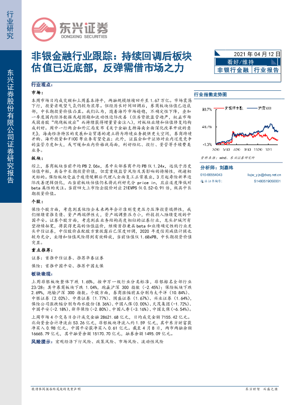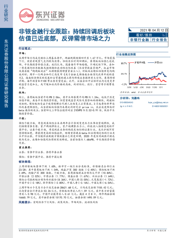 【东兴证券】【20210412】非银金融行业跟踪:持续回调后板块估值已近底部,反弹需借市场之力-8页