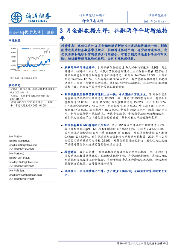 【海通证券】【20210413】3月金融数据点评:社融两年平均增速持平-3页