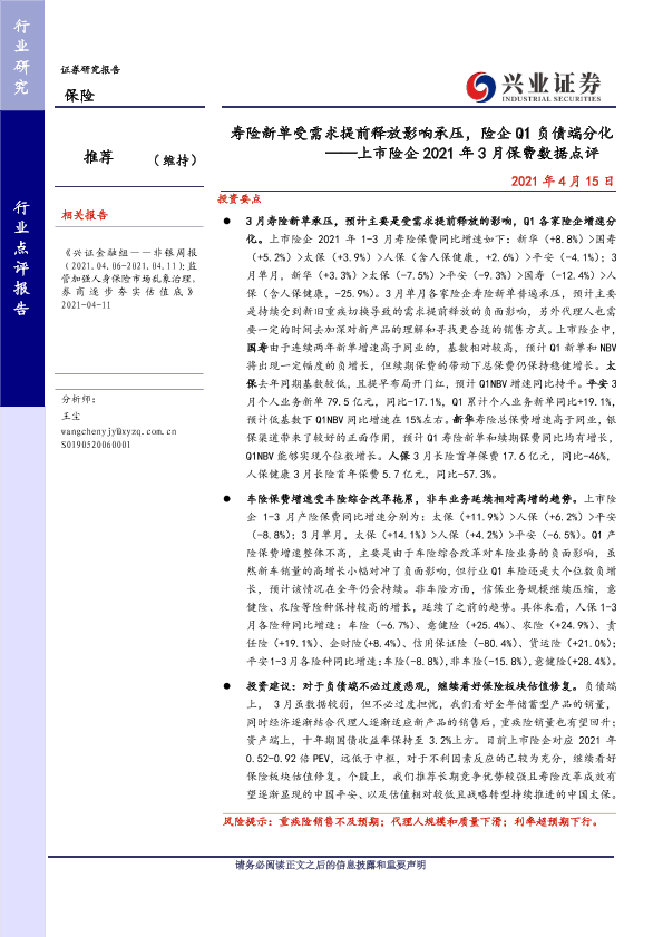 【兴业证券】【20210415】寿险新单受需求提前释放影响承压,险企Q1负债端分化-4页