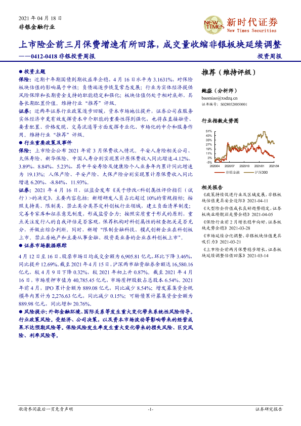 【新时代证券】【20210418】新时代证券非银投资周报:上市险企前三月保费增速有所回落,成交量收缩非银板块延续调整-13页
