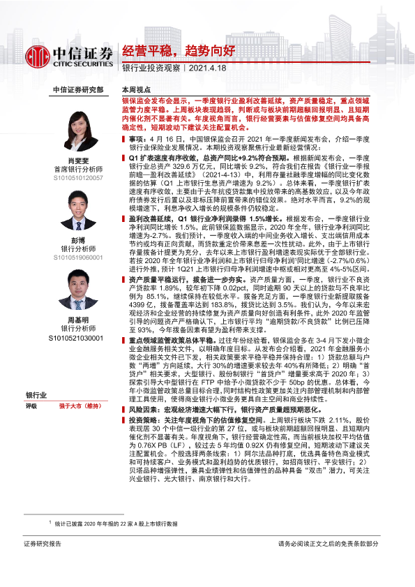 【中信证券】【20210418】银行业投资观察:经营平稳,趋势向好-10页