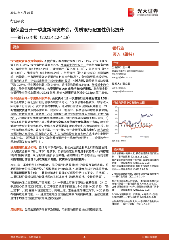 【光大证券】【20210419】银行业周报:银保监召开一季度新闻发布会,优质银行配置性价比提升-14页