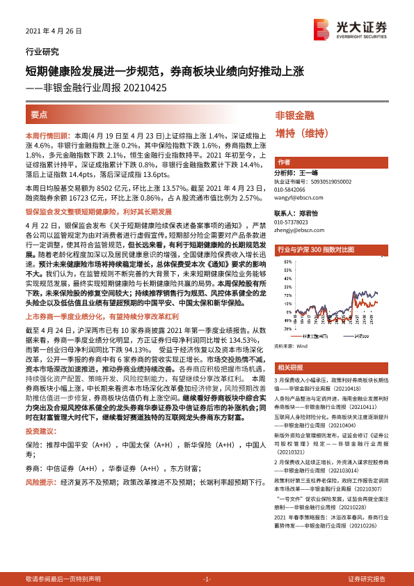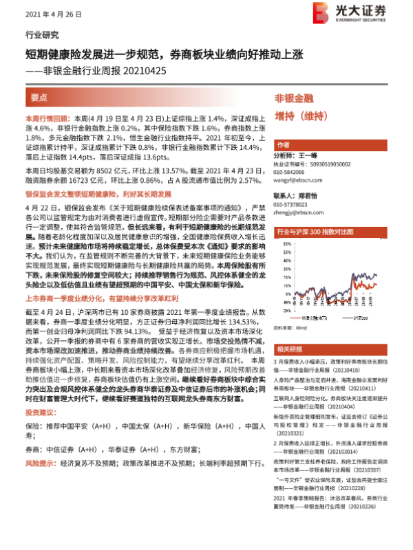 【光大证券】【20210425】短期健康险发展进一步规范,券商板块业绩向好推动上涨-10页