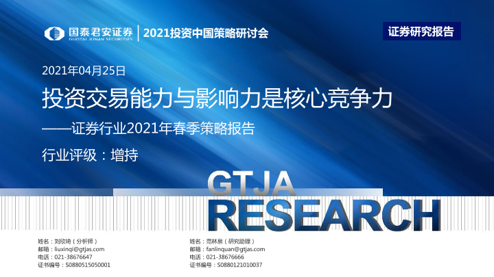 【国泰君安证券】【20210425】证券行业2021年春季策略报告:投资交易能力与影响力是核心竞争力-23页