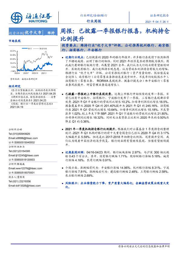 【海通证券】【20210426】银行行业周报:已披露一季报银行报喜,机构持仓比例提升-8页