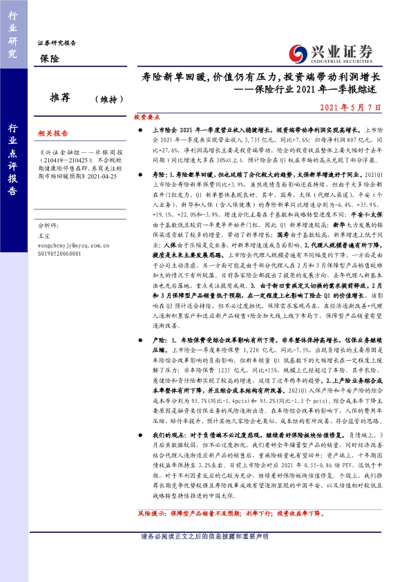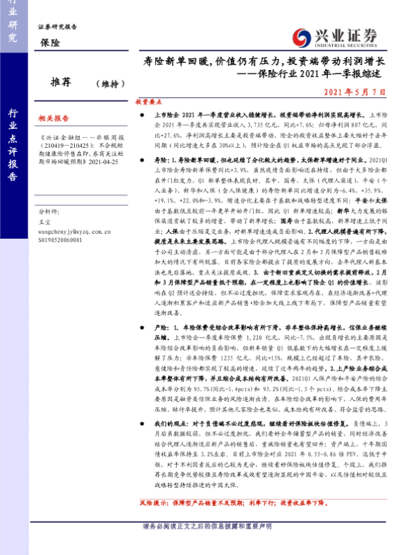 【兴业证券】【20210507】寿险新单回暖,价值仍有压力,投资端带动利润增长 ——保险行业2021年一季报综述-8页