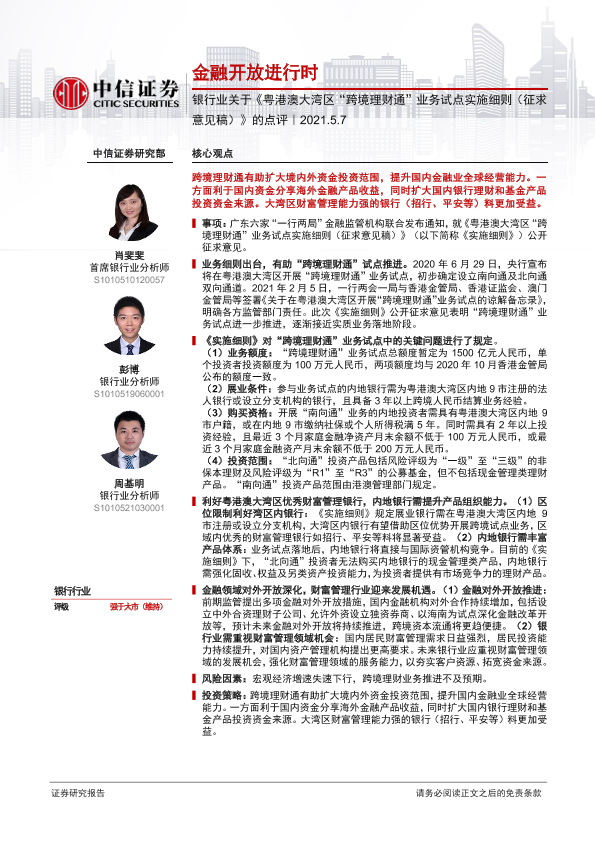 【中信证券】【20210507】银行业关于《粤港澳大湾区“跨境理财通”业务试点实施细则(征求意见稿)》的点评-2页