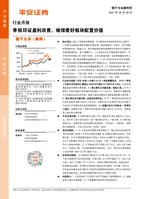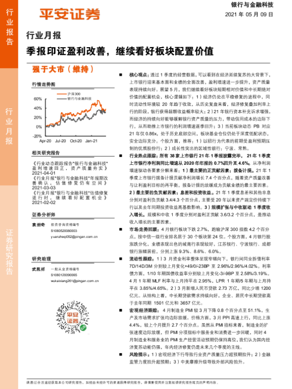 【平安证券】【20210509】银行与金融科技行业月报:季报印证盈利改善,继续看好板块配置价值-17页