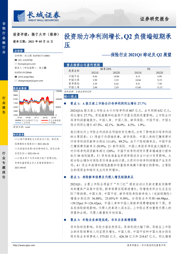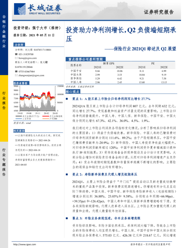 【长城证券】【20210511】保险行业2021Q1综述及Q2展望:投资助力净利润增长,Q2负债端短期承压-17页