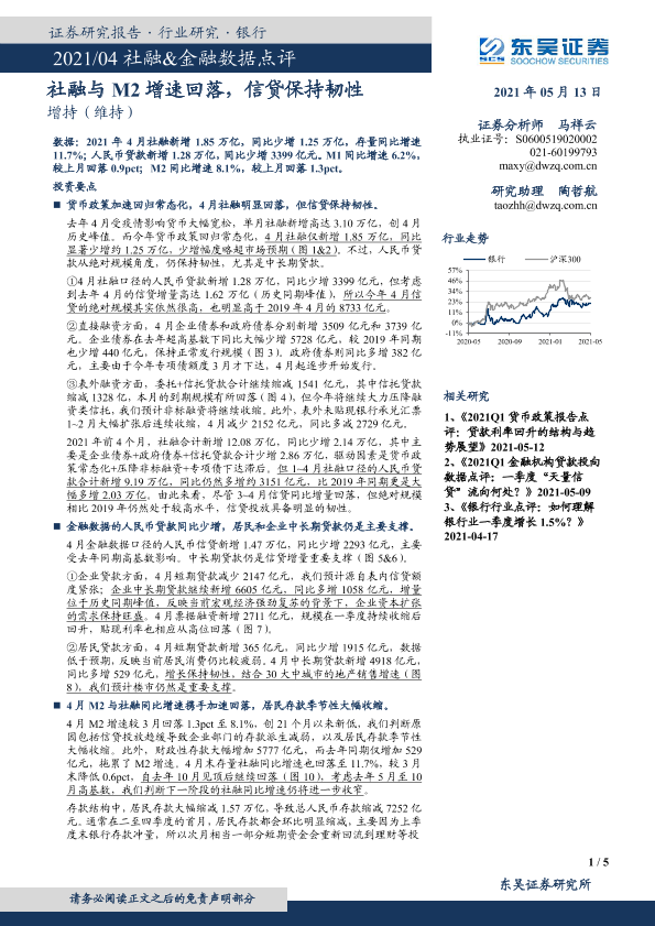 【东吴证券】【20210513】2021 04社融&金融数据点评:社融与M2增速回落,信贷保持韧性-5页