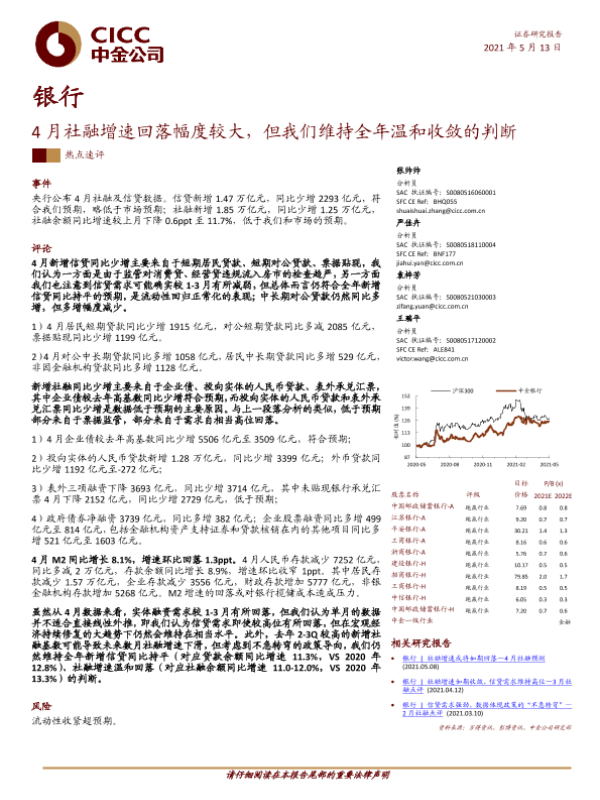 【中金公司】【20210513】4月社融增速回落幅度较大,但我们维持全年温和收敛的判断-6页