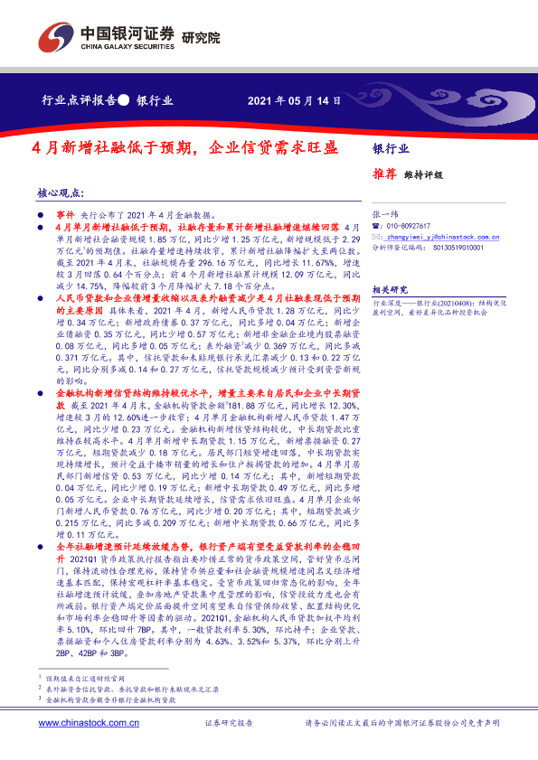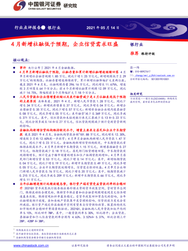 【银河证券】【20210514】4月新增社融低于预期,企业信贷需求旺盛-5页