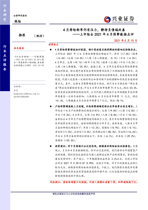 【兴业证券】【20210515】4月寿险新单仍有压力,静待负债端改善-4页