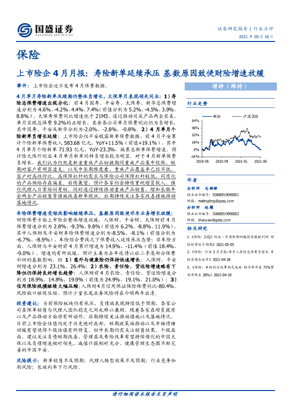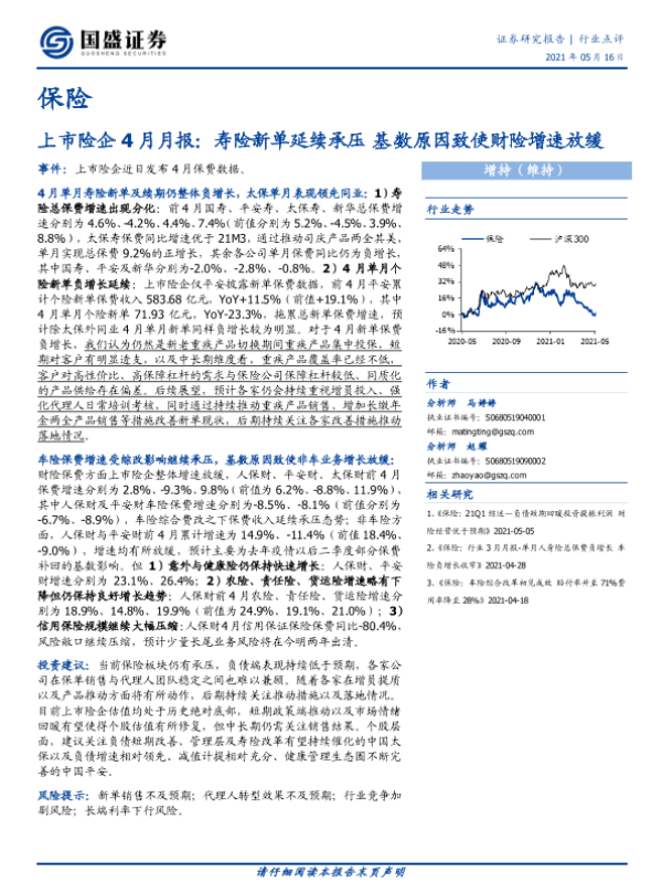 【国盛证券】【20210516】上市险企4月月报:寿险新单延续承压 基数原因致使财险增速放缓-3页