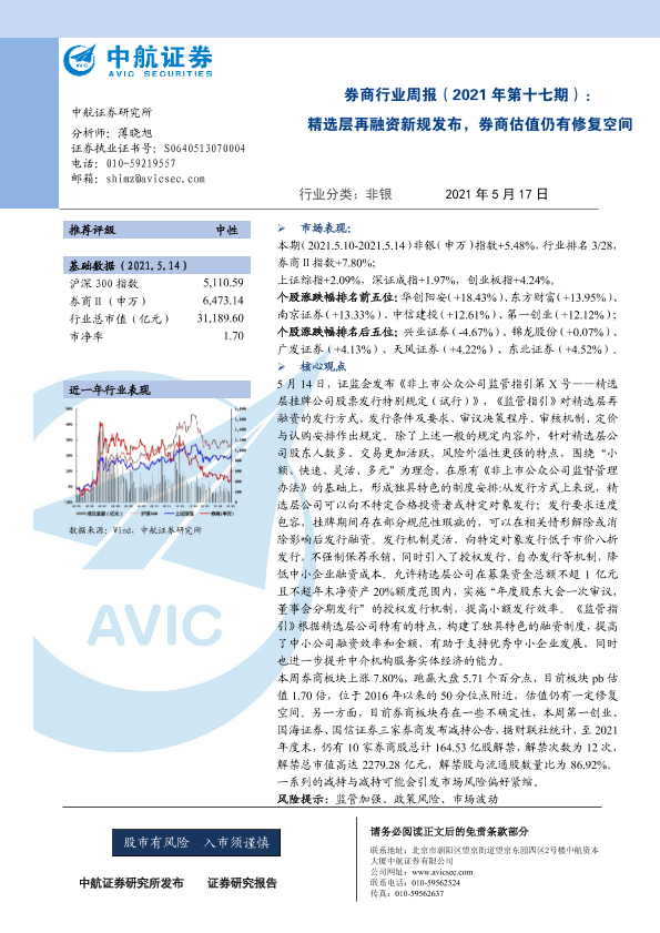 【中航证券】【20210517】券商行业周报(2021年第十七期):精选层再融资新规发布,券商估值仍有修复空间-5页