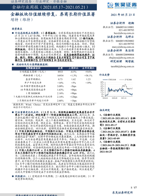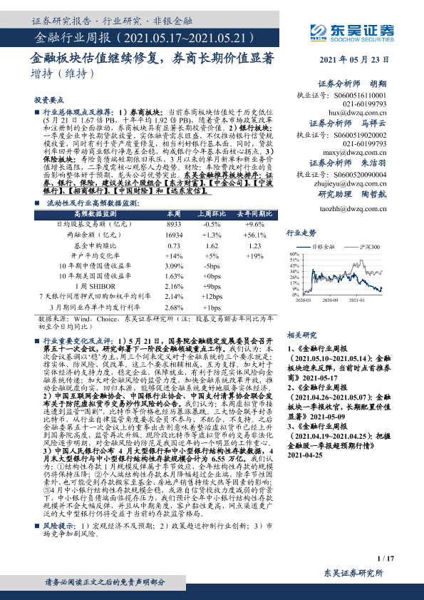 【东吴证券】【20210523】金融行业周报:金融板块估值继续修复,券商长期价值显著-17页