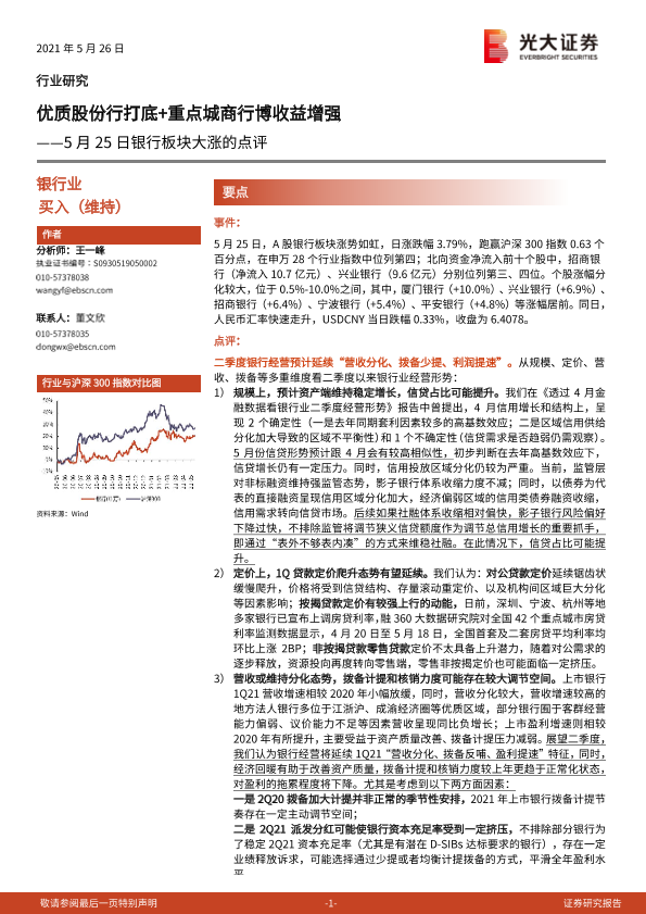 【光大证券】【20210526】5月25日银行板块大涨的点评:优质股份行打底+重点城商行博收益增强-4页