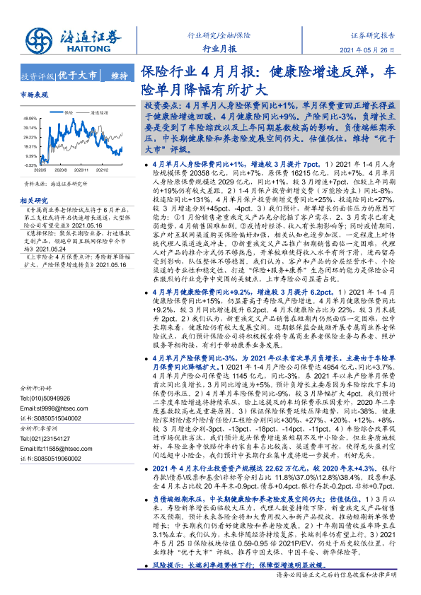 【海通证券】【20210526】保险行业4月月报:健康险增速反弹,车险单月降幅有所扩大-5页