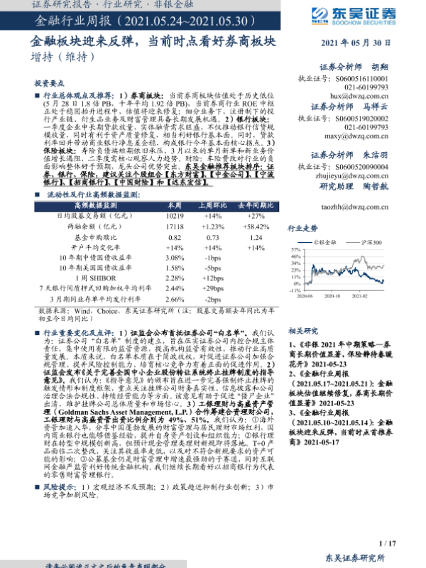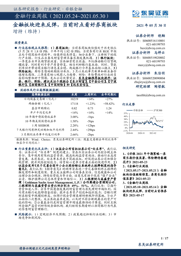 【东吴证券】【20210530】金融行业周报:金融板块迎来反弹,当前时点看好券商板块-17页
