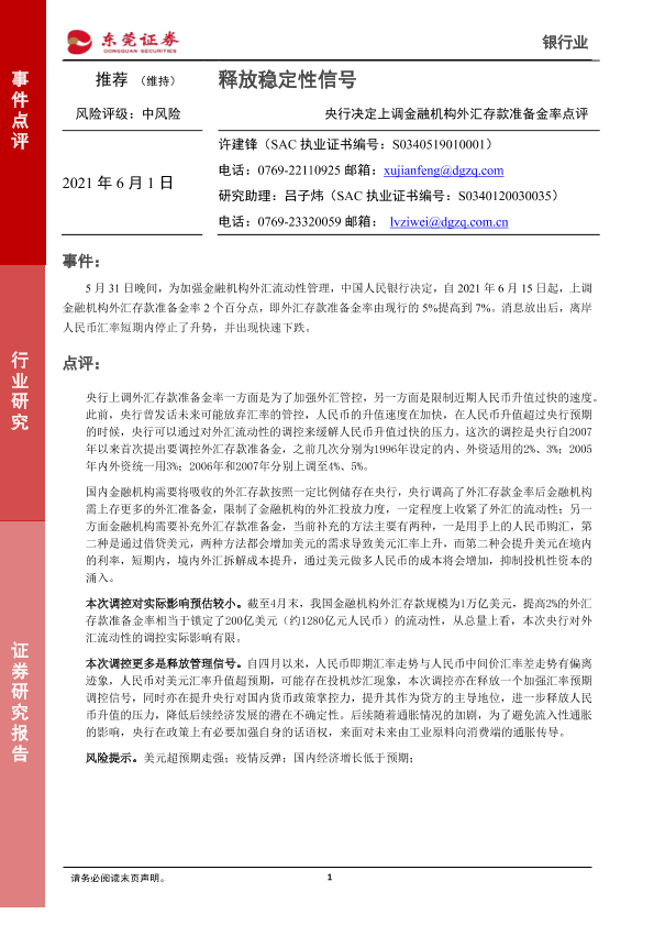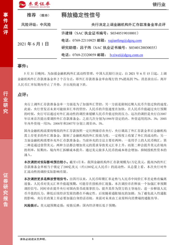 【东莞证券】【20210601】银行业央行决定上调金融机构外汇存款准备金率点评:释放稳定性信号-2页