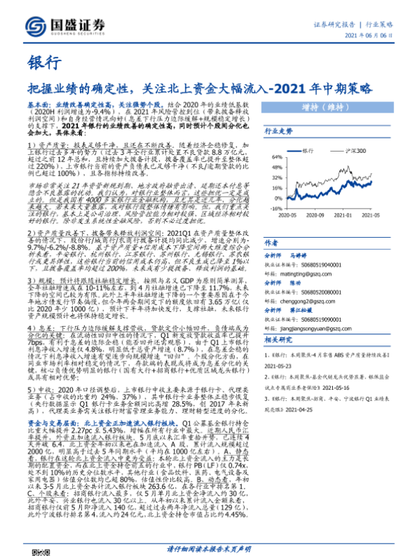 业绩改善 北上资金 息差 资产质量 银行