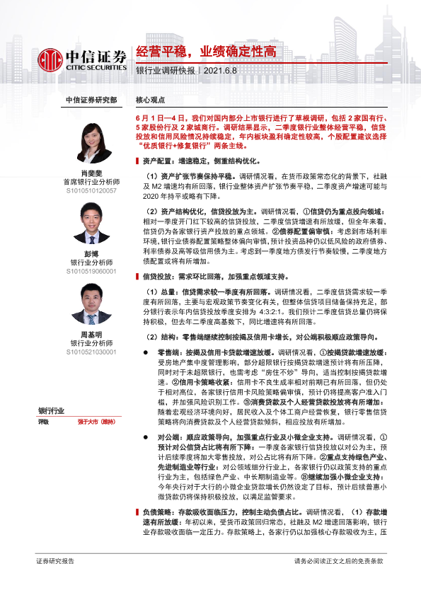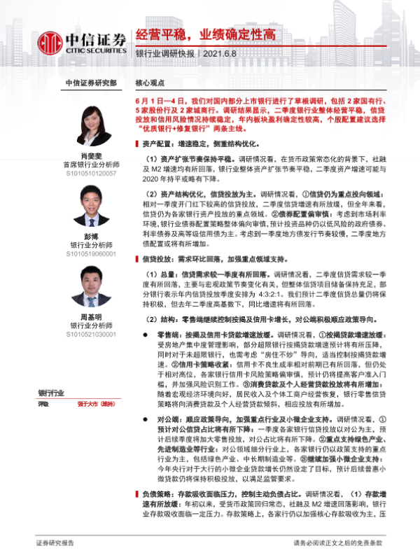 【中信证券】【20210608】银行业调研快报:经营平稳,业绩确定性高-3页