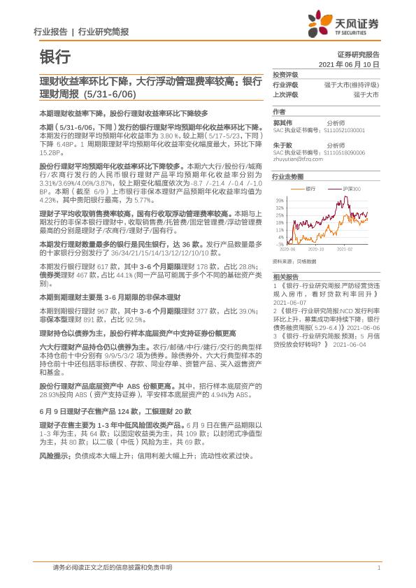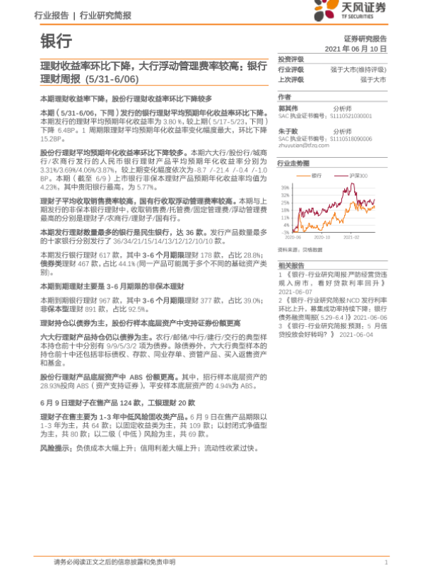 【天风证券】【20210610】银行理财周报:理财收益率环比下降,大行浮动管理费率较高-18页