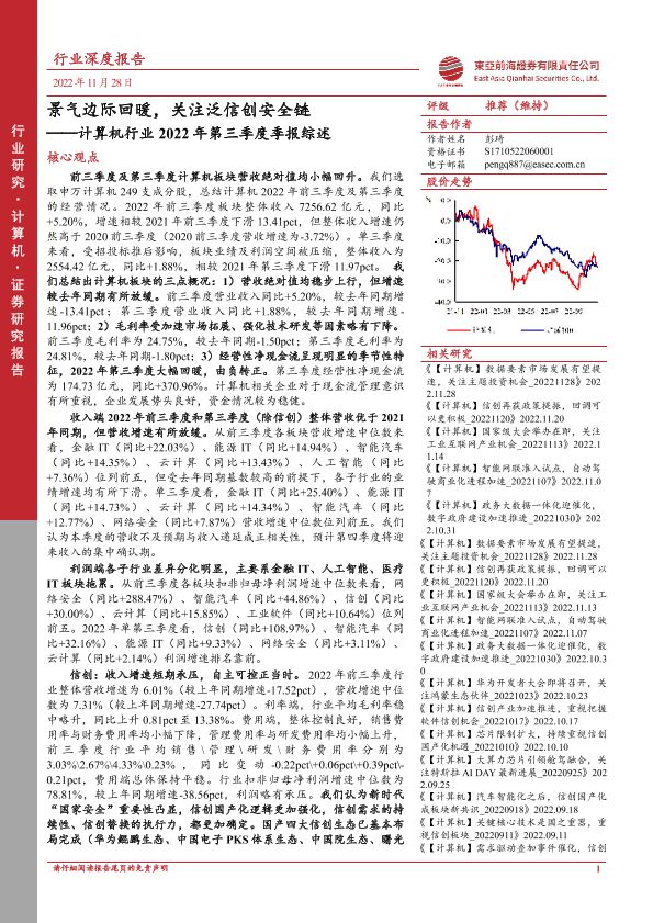 【东亚前海证券】【20221128】计算机行业2022年第三季度季报综述:景气边际回暖,关注泛信创安全链-43页