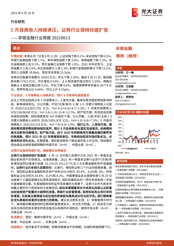 【光大证券】【20210614】非银金融行业周报:5月保费收入持续承压,证券行业保持快速扩张-9页