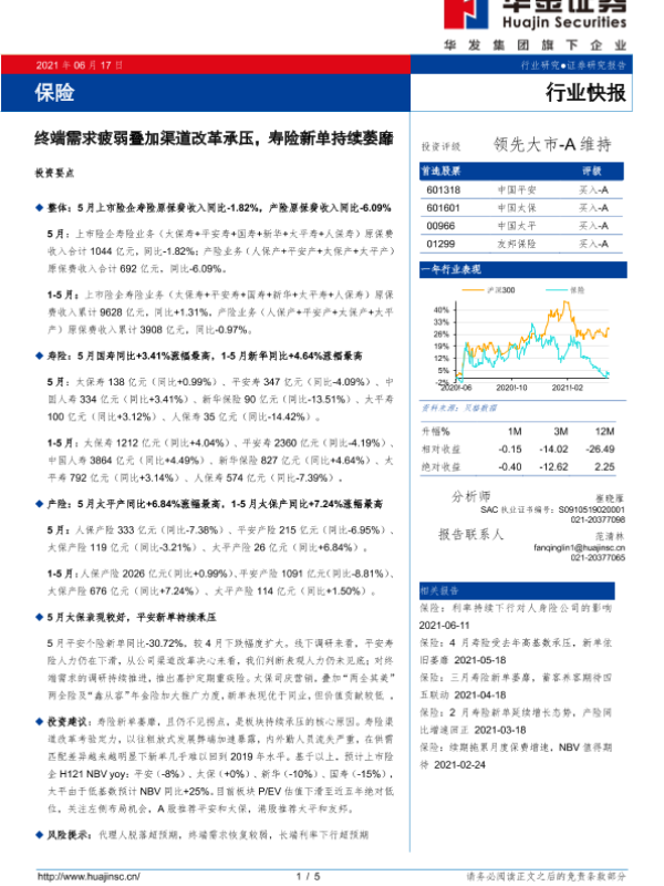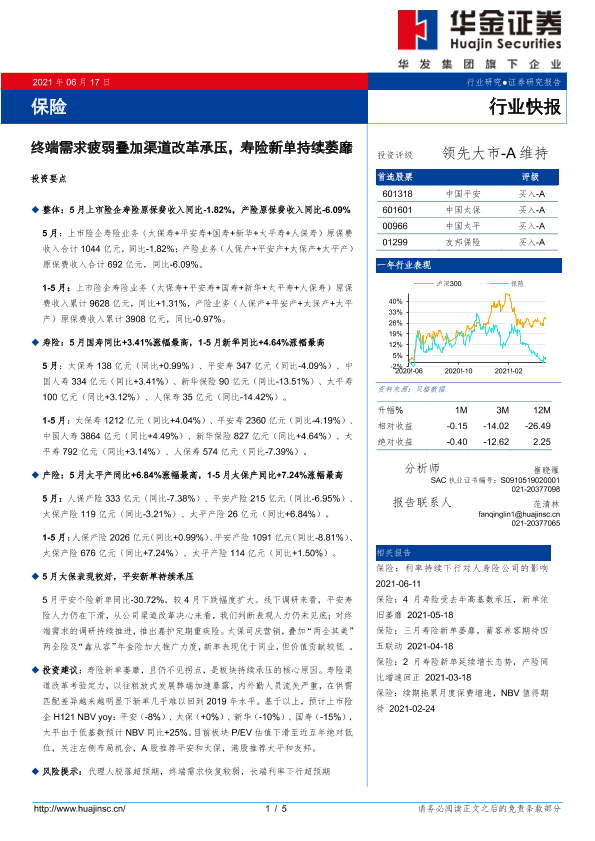 【华金证券】【20210617】终端需求疲弱叠加渠道改革承压,寿险新单持续萎靡-5页