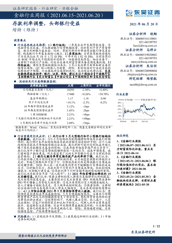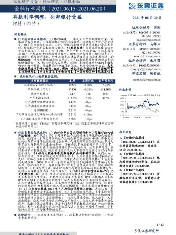 【东吴证券】【20210620】金融行业周报:存款利率调整,头部银行受益-22页