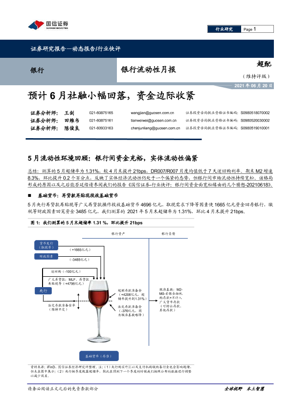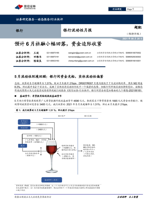 【国信证券】【20210620】银行流动性月报:预计6月社融小幅回落,资金边际收紧-9页