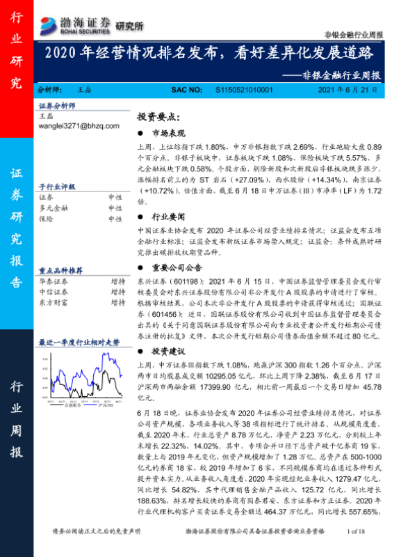 【渤海证券】【20210621】非银金融行业周报:2020年经营情况排名发布,看好差异化发展道路-18页