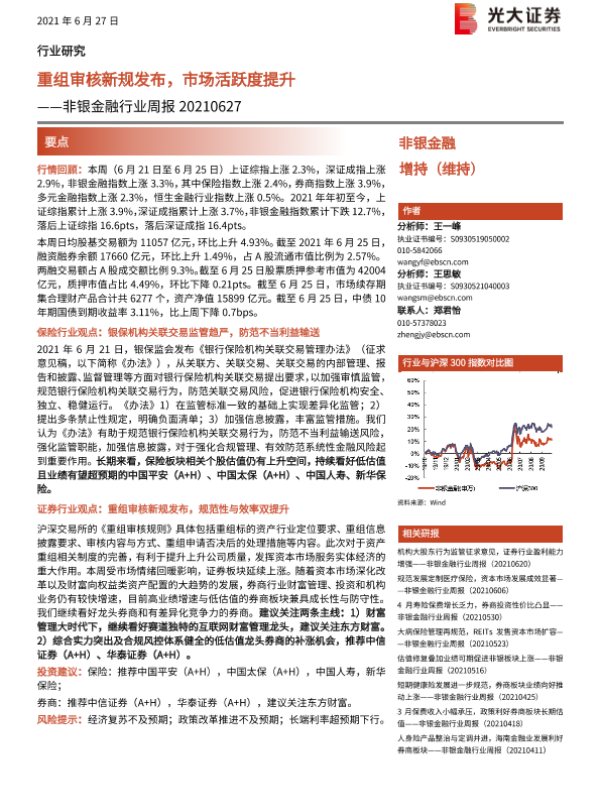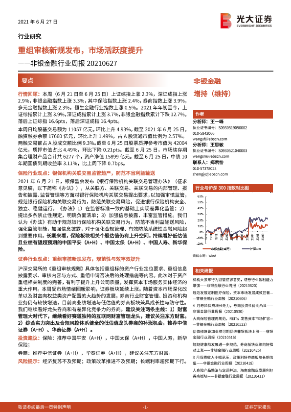 【光大证券】【20210627】非银金融行业周报:重组审核新规发布,市场活跃度提升-9页