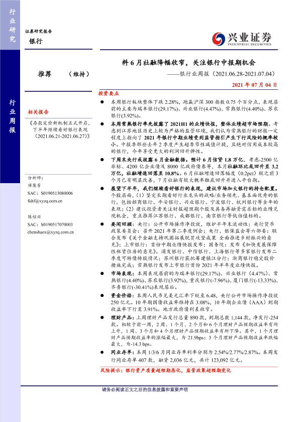 【兴业证券】【20210704】银行业周报:料6月社融降幅收窄,关注银行中报期机会-17页