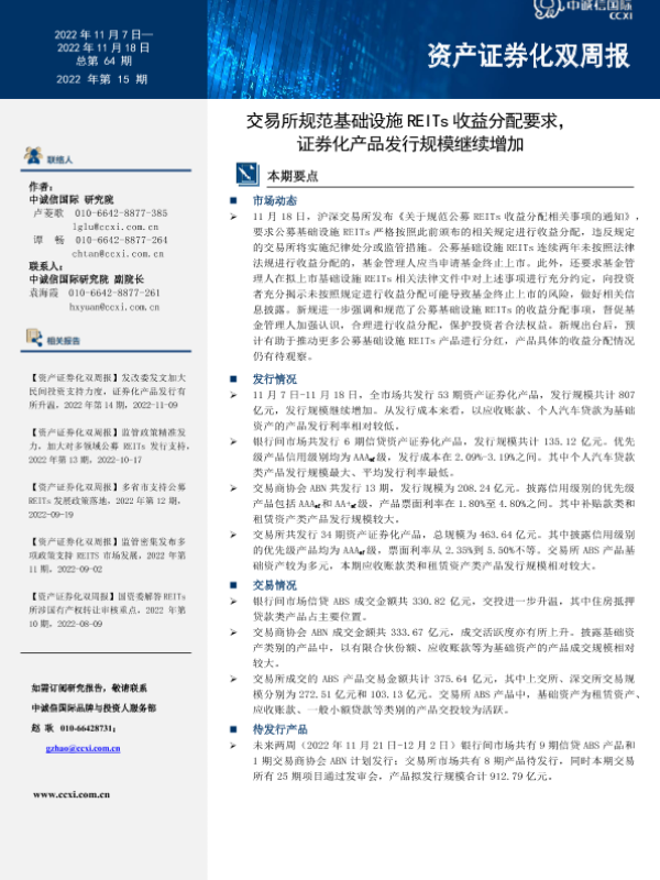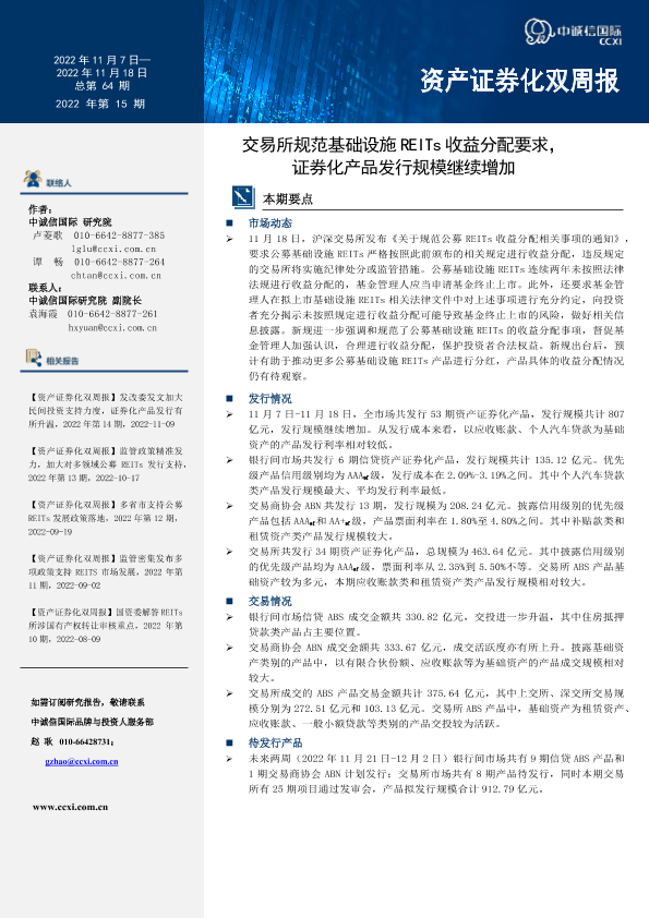【中诚信国际】【20221109】资产证券化双周报:交易所规范基础设施REITs收益分配要求,证券化产品发行规模继续增加-15页