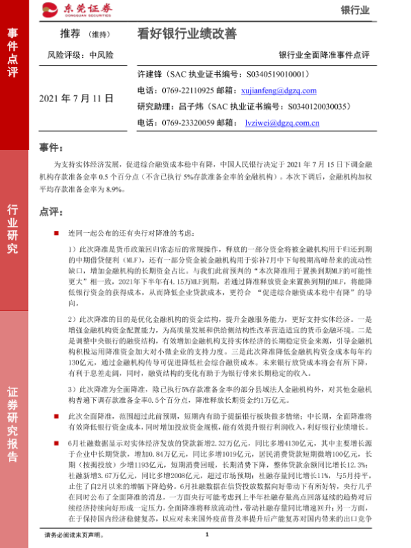 【东莞证券】【20210711】银行业全面降准事件点评:看好银行业绩改善-3页