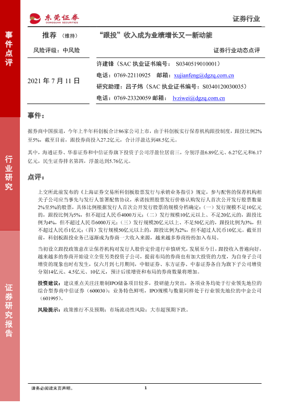 【东莞证券】【20210711】证券行业动态点评:“跟投”收入成为业绩增长又一新动能-2页