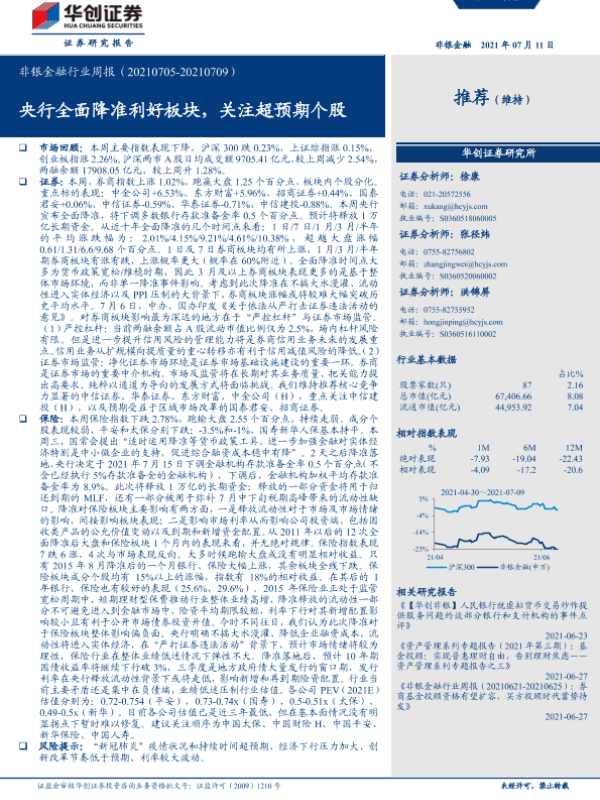 【华创证券】【20210711】非银金融行业周报:央行全面降准利好板块,关注超预期个股-18页