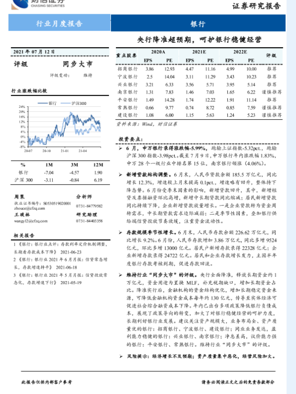 【财信证券】【20210712】银行行业月度报告:央行降准超预期,呵护银行稳健经营-9页