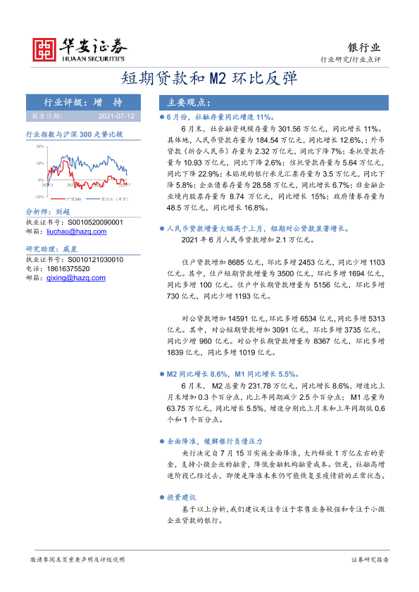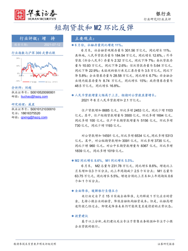 【华安证券】【20210712】银行业点评:短期贷款和M2环比反弹-7页