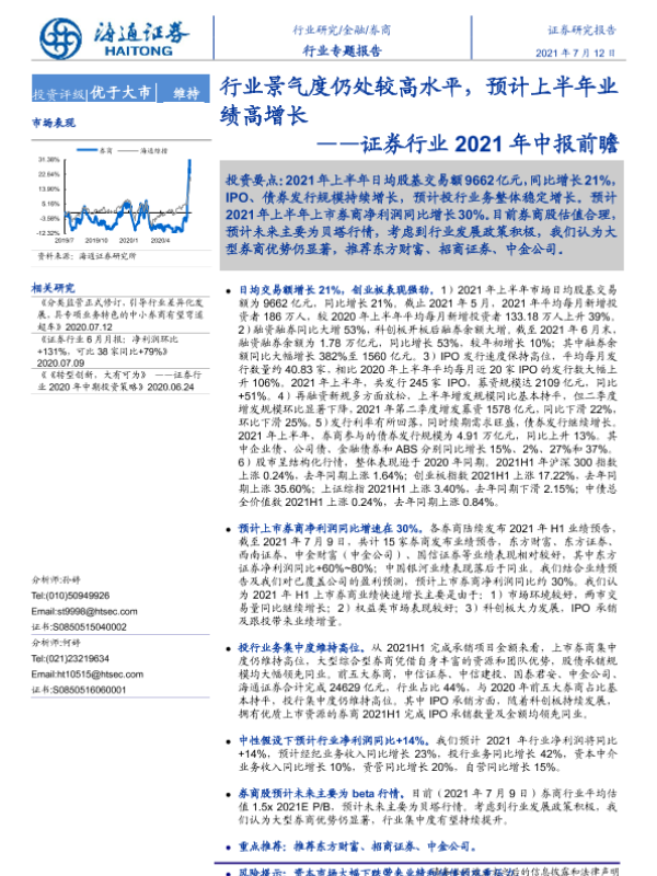 【海通证券】【20210712】证券行业2021年中报前瞻:行业景气度仍处较高水平,预计上半年业绩高增长-17页