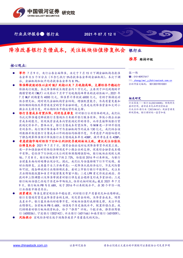 【银河证券】【20210712】降准改善银行负债成本,关注板块估值修复机会-2页