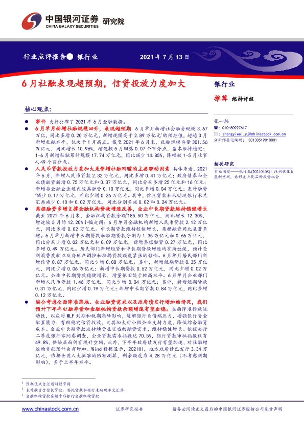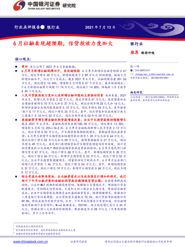 【银河证券】【20210713】6月社融表现超预期,信贷投放力度加大-5页