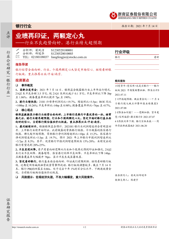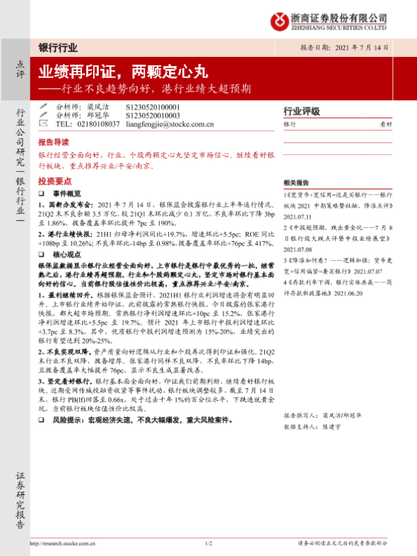 【浙商证券】【20210714】银行行业不良趋势向好,港行业绩大超预期:业绩再印证,两颗定心丸-2页
