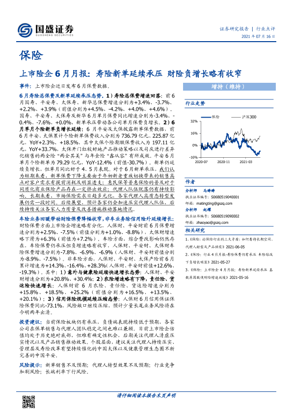 【国盛证券】【20210716】上市险企6月月报:寿险新单延续承压财险负增长略有收窄-3页